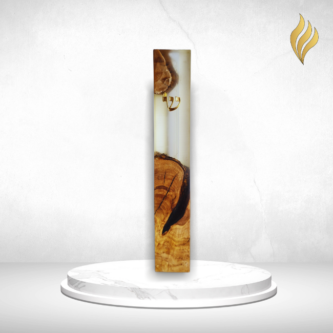 עיצוב אלגנטי עם צד שמאלי עליון עץ זית וחלק תחתון, עובר בתוך השקיפות – מזוזה מעוצבת בגודל 25 סנטימטר לכניסה לבית בעיצוב מודרני יוקרתי שתהפוך את הכניסה שלכם לחוויה של ממש! עשויה אפוקסי פרימיום ועץ זית.